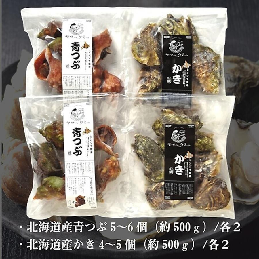 ・内容量:北海道産青つぶ5〜6個(約500g)・北海道産かき4〜5個(約500g)×各3