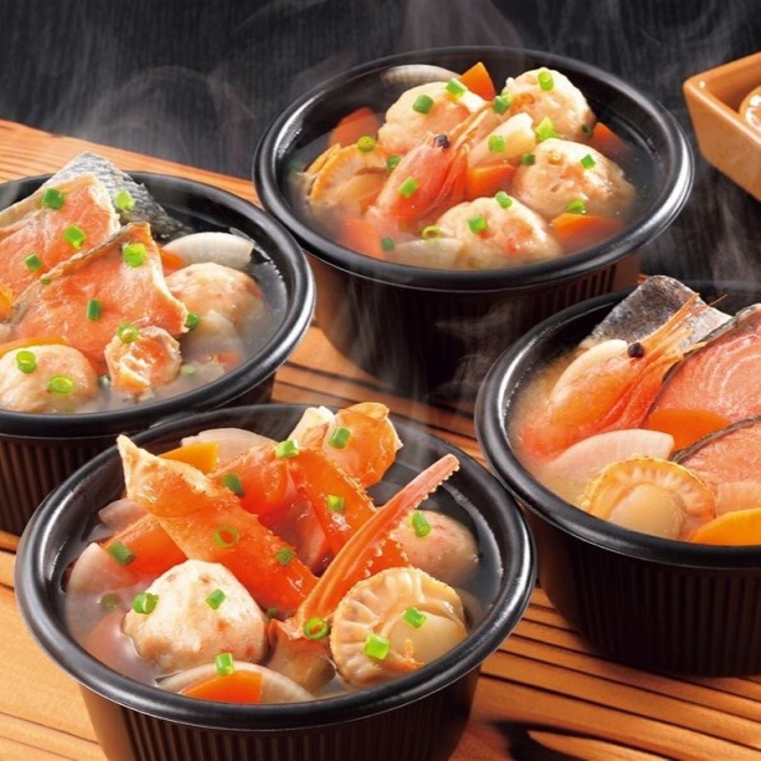 レンジで温めるだけですぐに食べられる、本格海鮮鍋の詰合せです。秋鮭、サーモントラウトを使用し出汁の風味を味わえる塩味仕立の鮭うしお汁,ふわふわの食感と各具材の出汁がしみ込んだつみれが入ったお醤油味のつみれ鍋。一人分なのでいつでもお手軽にお楽しみいただけます。