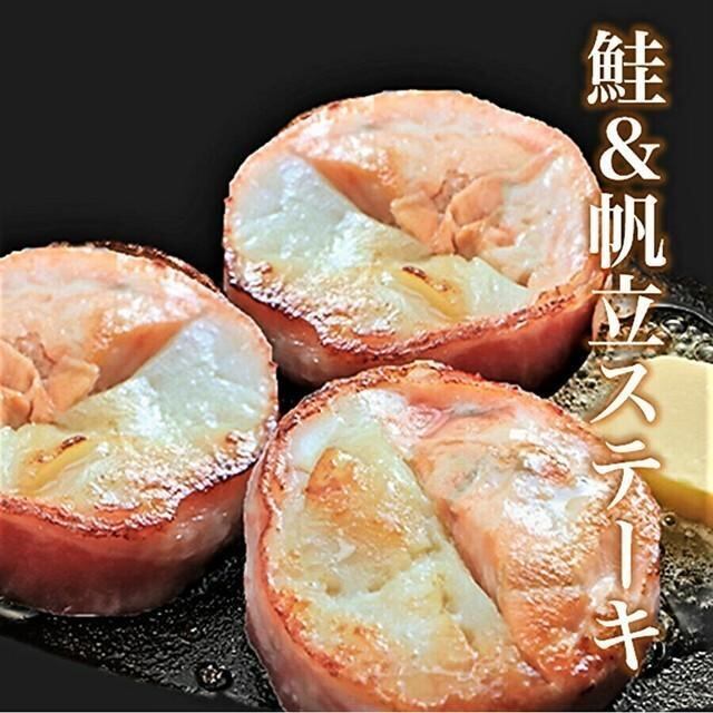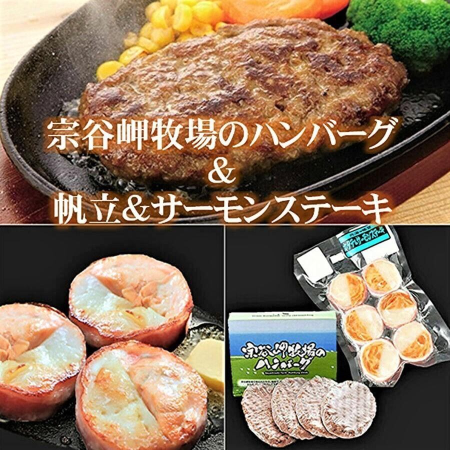 宗谷岬牧場のハンバーグ1枚120g(4枚入パッケージ箱)とホタテ&サーモン(ハーフ&ハーフ)ステーキ 6枚(1パック)のセットです。宗谷岬牧場のハンバーグは日本最北端の地、宗谷岬の丘陵地帯に広がる牧場で放し飼いにされた牛を原料に製造しています。牛肉、小麦、玉ねぎなど主要原材料は北海道産を使用し、安全・安心にこだわったハンバーグです。たっぷりの肉汁でとってもジュ〜シ〜でソース要らずの美味しさが自慢のハンバーグ新鮮なです。ホタテ&サーモンは、稚内(宗谷)産の新鮮なホタテと鮭の身を粗ほぐしにして、デンマーク産の特製ベーコンで巻き込んでギュッと美味しさを凝縮させた海鮮ステーキです。フライパンで焼くだけの簡単調理で、本格的な海鮮ステーキをお楽しみいただけます。