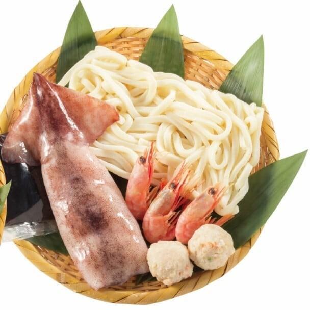商品:【海鮮えび鍋】:ボイル甘えび/3尾、えび入つみれ/2個、つぼ抜きいか/100g、うどん/250g、えび魚醤油入りたれ/50ml×1袋・2人前〜3人前