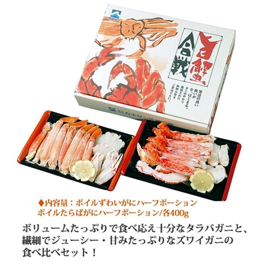 ・内容量:ボイルずわいがにハーフポーション(グリーンランド産)/400g・ボイルたらばがにハーフポーション(ロシ産)/300g
