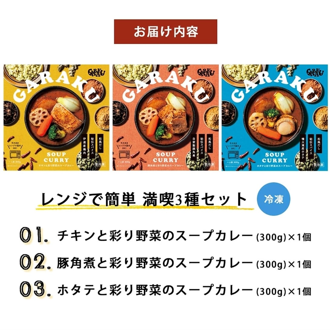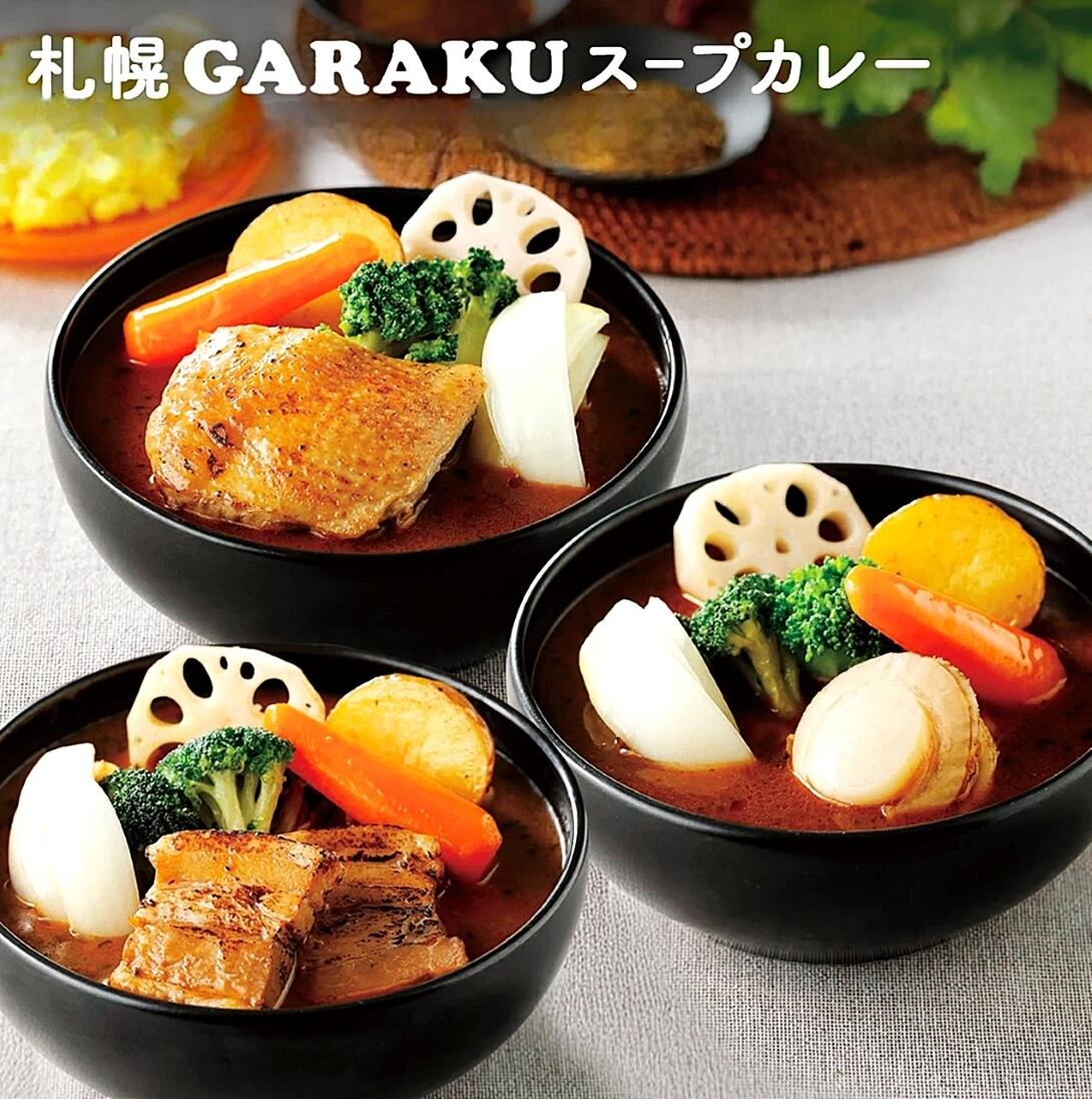 札幌で人気のスープカレー店GARAKUの味を、レンジで温めるだけで手軽に楽しめます。チキン、豚角煮、ホタテの3種類の味が楽しめる、本格的なGARAKUのスープカレーを味わいたい方に。