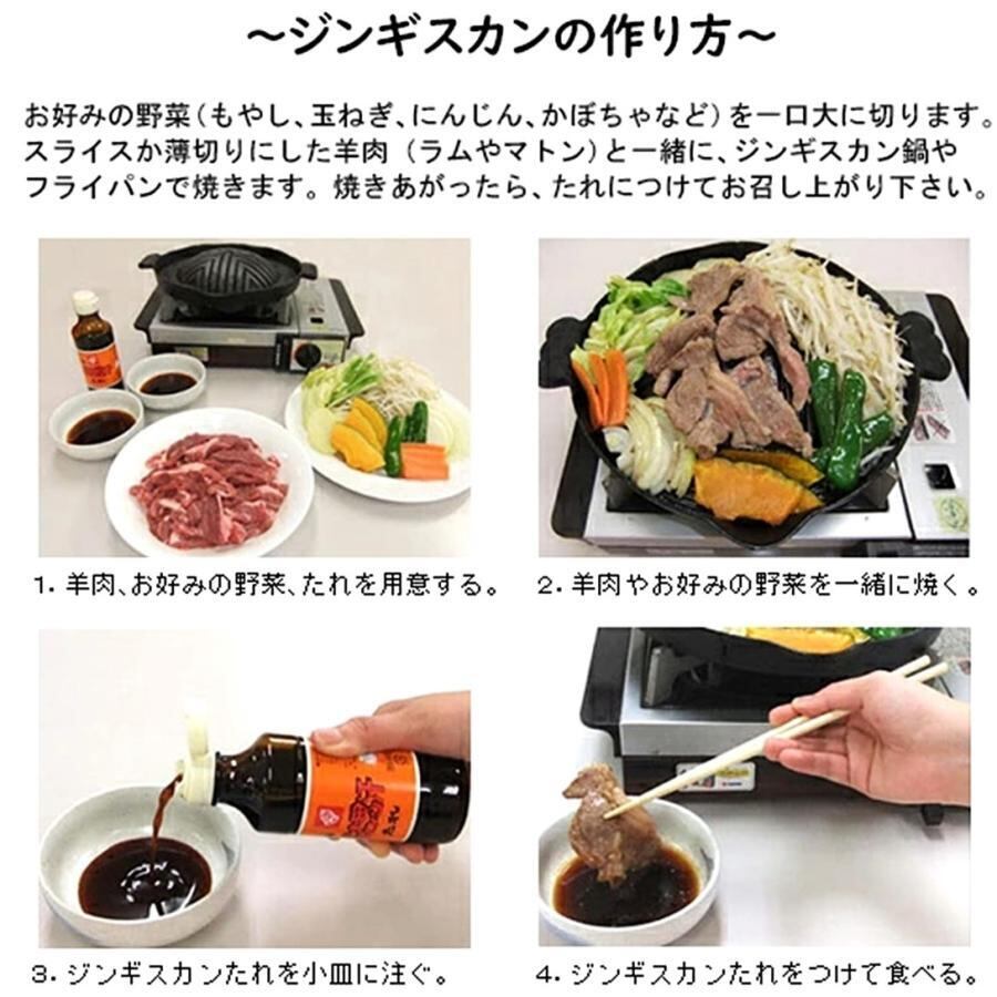 うす切りのラム・マトンを野菜と一緒に焼き、この「たれ」をつけてお召しあがりください。また焼く前に漬け込むと、ひと味ちがったジンギスカンになります。牛、豚、鶏の焼肉やしゃぶしゃぶなどにもお使いいただけます。