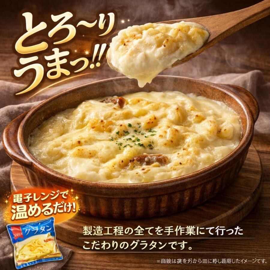 ベシャメルソースには、水を一切使わずに豊富町産の生クリームと牛乳のみで練り上げ具材は宗谷産ほたて貝柱フレークを使用しました。製造工程の全てを手作業にて行ったこだわりのグラタンです。