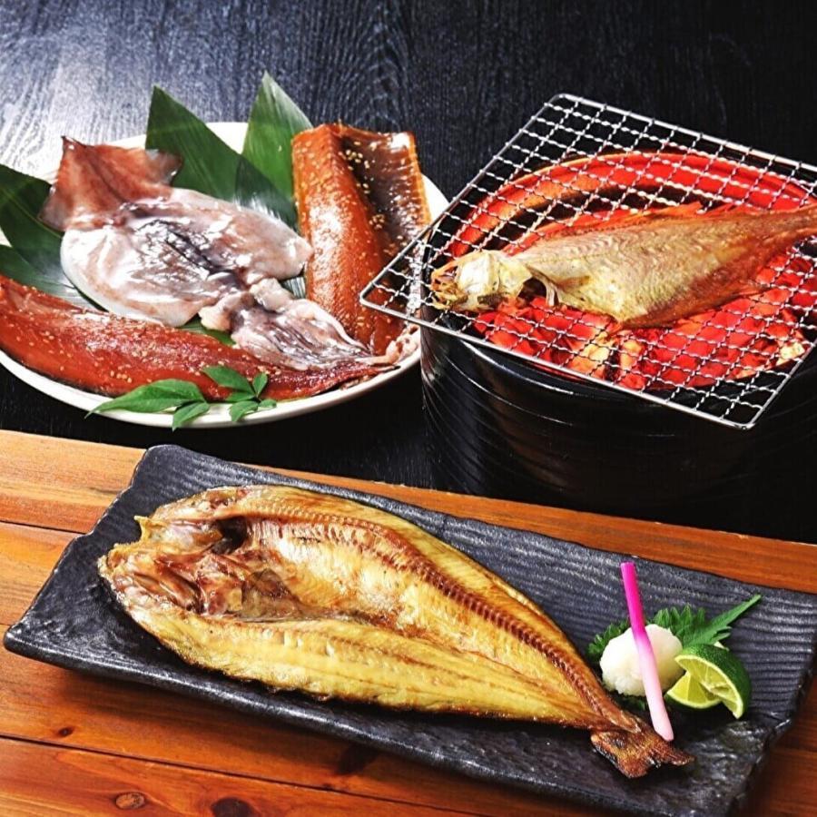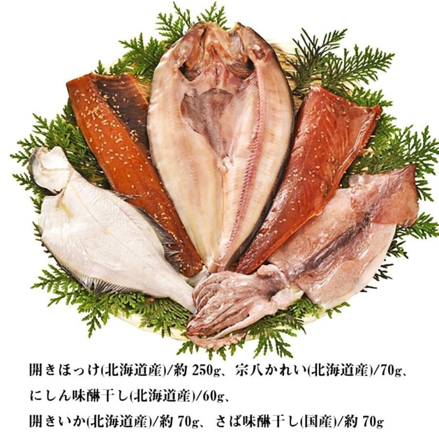 セット内容 開きほっけ(北海道産)/約250g、にしん味醂干し(北海道産)/60g、宗八かれい(北海道産)/70g、開きいか(北海道産)/約70g、さば味醂干し(国産)/約70g