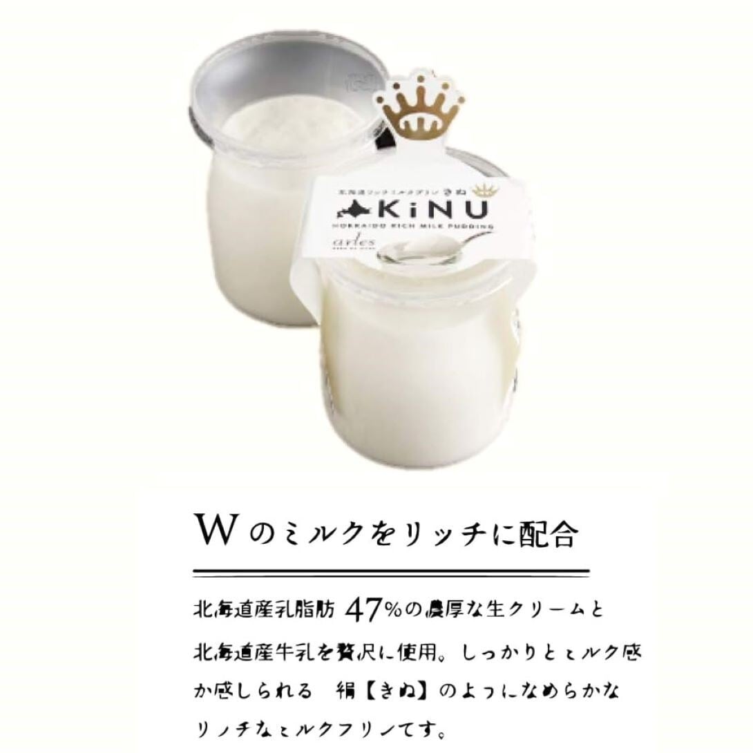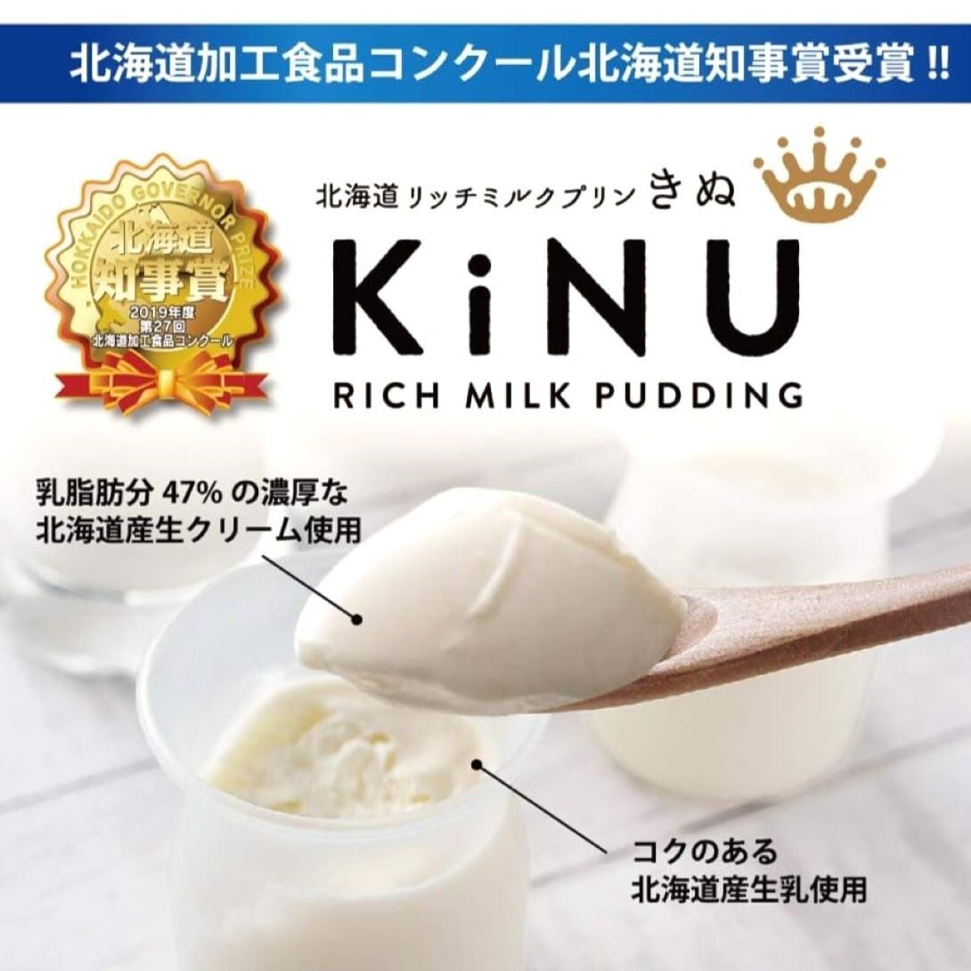 KiNU:乳脂肪分47%の北海道産生クリームと、北海道産牛乳を贅沢に使用。しっかりとミルク感が感じられ絹【きぬ】のようになめらか。2つのミルクの美味しさをぎゅーっと詰め込んだリッチで濃厚なあじわいの「北海道リッチミルクプリン