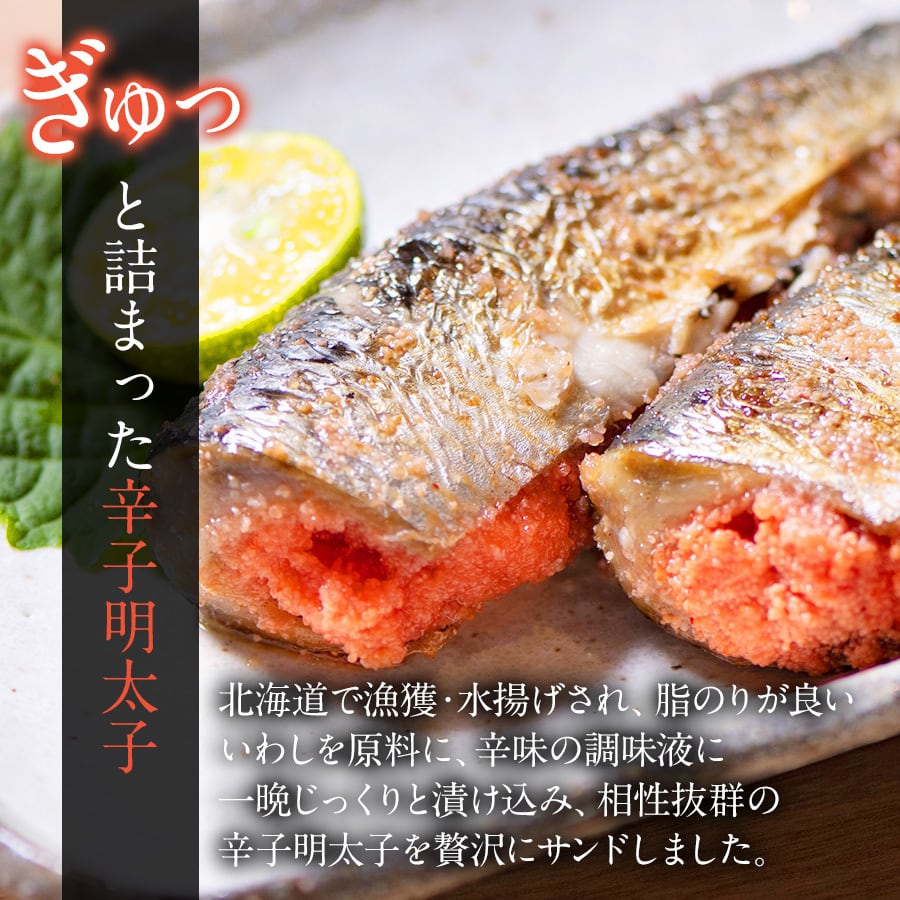 北海道で漁獲・水揚げされた脂の乗ったいわしを原材料に使用しています。辛みの調味液に一晩じっくりと漬け込み、相性抜群の辛子明太子を贅沢にサンドしました。