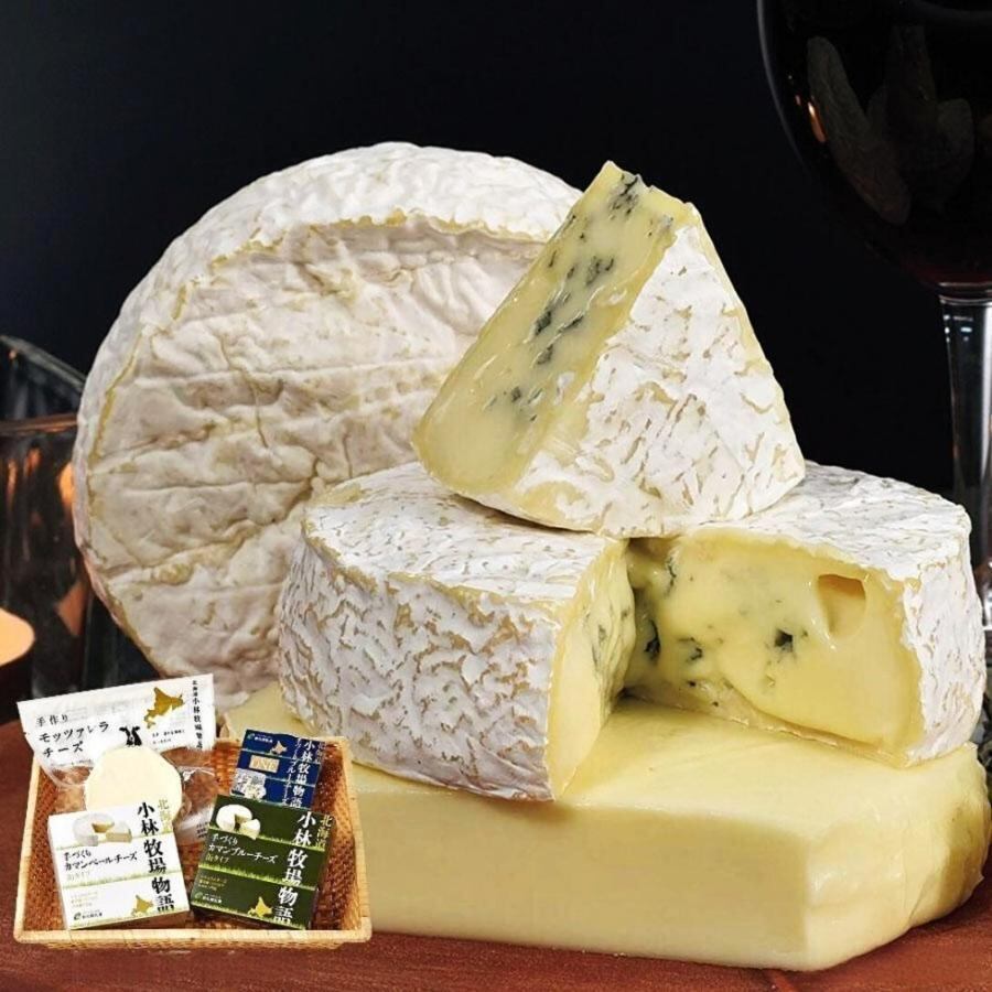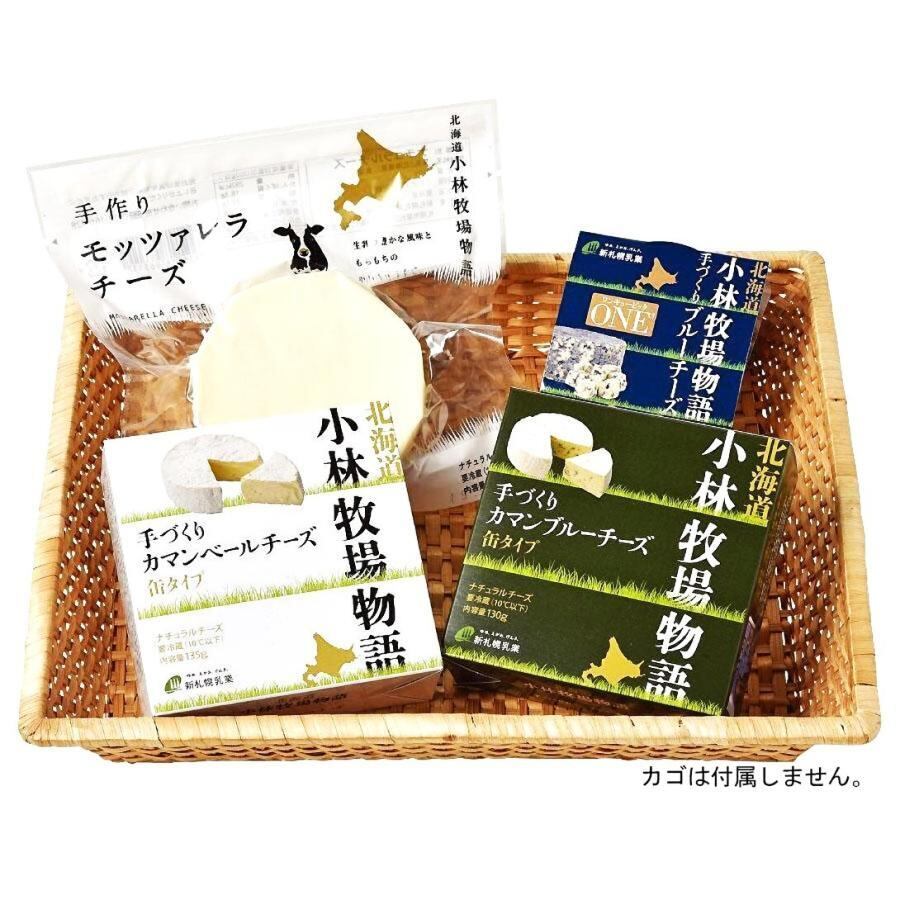 セット内容 北海道小林牧場物語手づくりカマンベールチーズ/135g、北海道小林牧場物語手づくりカマンブルーチーズ/130g、北海道小林牧場物語手づくりモッツァレラチーズ/120g、北海道小林牧場物語ワンキュービックブルーチーズ/30g
