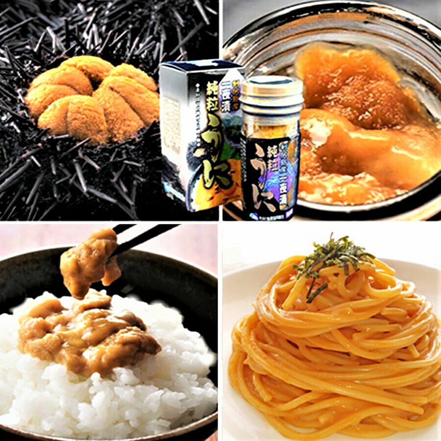最高の天然利尻昆布を食べて育ったムラサキウニを、添加物を一切使わず一晩塩水に漬け込む熟成製法で、自然の味、素材、香りを生かした商品です。