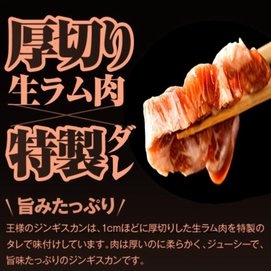 「王様のジンギスカン」は厚さ約1cmの厚切りジンギスカンのラムロース肉使用特製のたれにじっくりと漬け込むことで、肉の旨みを引き出し、極上の逸品に仕上がっています。