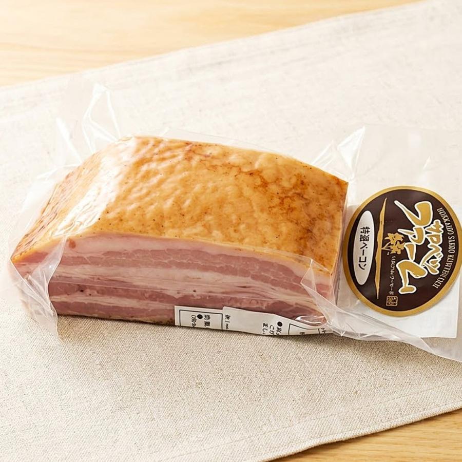 サロベツファームオーナー板谷氏のオリジナルブレンドチップでゆっくりスモークをかけ大切に造り上げた逸品。必要以上の食塩は使用せず、肉に味がしっかりとなじむように漬け込み、肉の持つ旨味が最大限に引き出されたベーコンブロック。