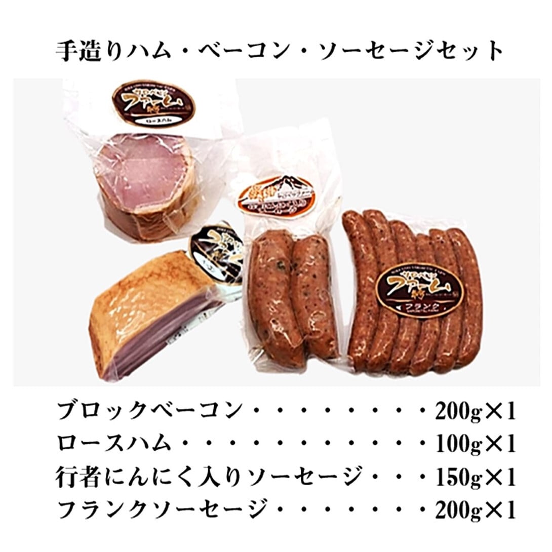 ロースハム100g、ウインナー200g、行者にんにくソーセージ150g、ベーコン200g