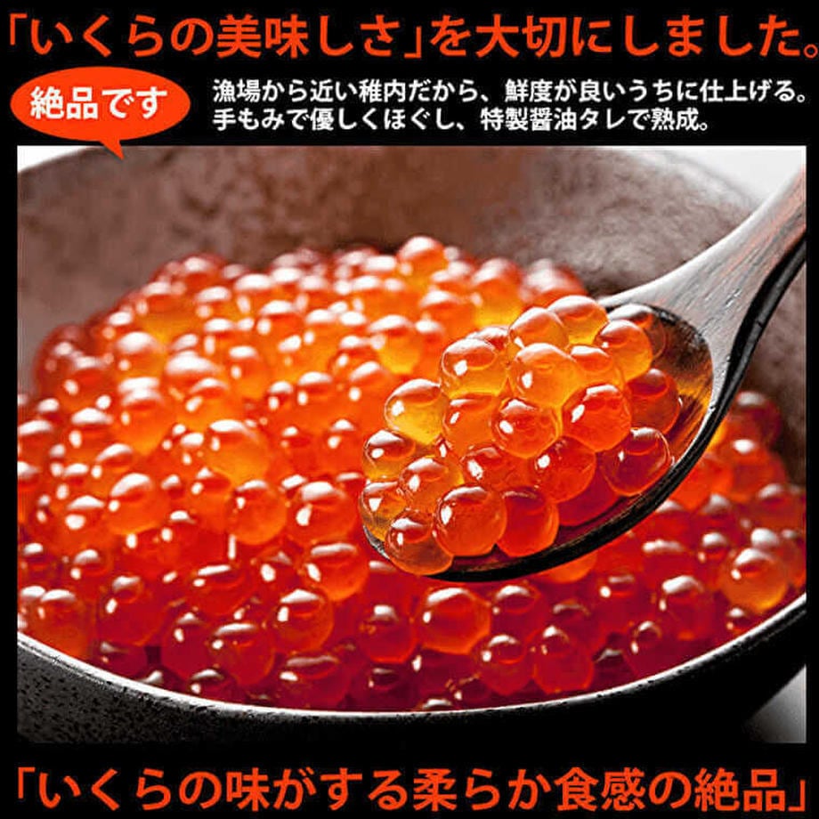 完熟いくらだけを選び出し、稚内のいくら加工の老舗が丁寧に手造り。特製白醤油で仕上げた絶品いくらです。口の中に皮が残らない柔らかないくらは最高ランク品の証。使いやすい100グラム瓶2本でのお届けになります。※ケース代金が含まれております。ご自宅用でケースが必要でなければバラでお申込み下さい。