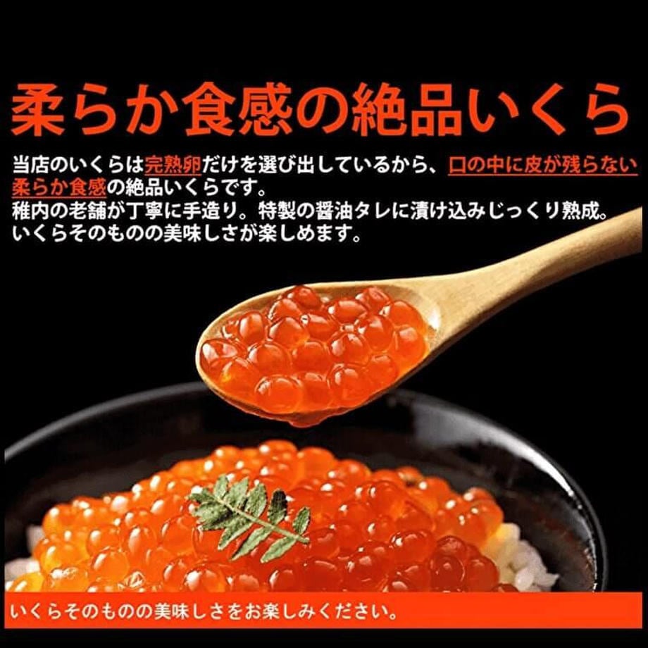 完熟いくらだけを選び出し、稚内のいくら加工の老舗が丁寧に手造り。特製白醤油で仕上げた絶品いくらです。口の中に皮が残らない柔らかないくらは最高ランク品の証。使いやすい100グラム瓶2本でのお届け になります。