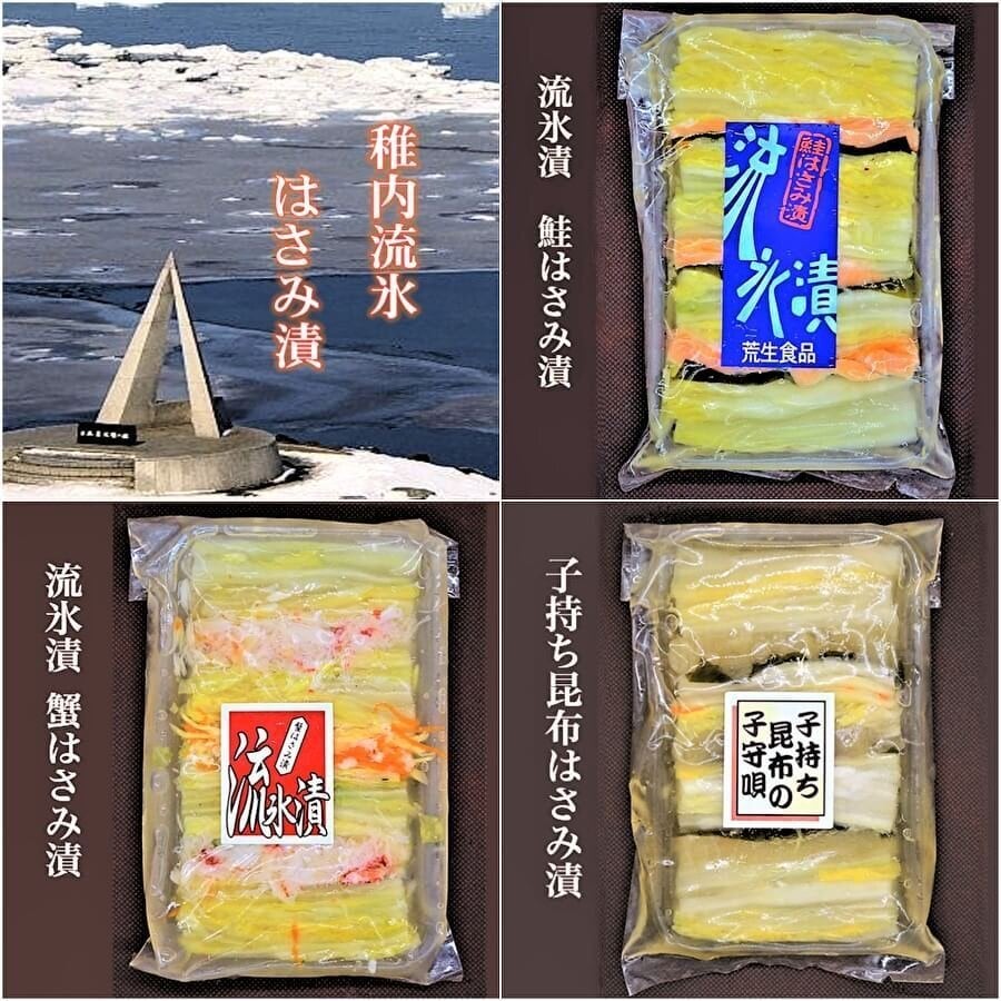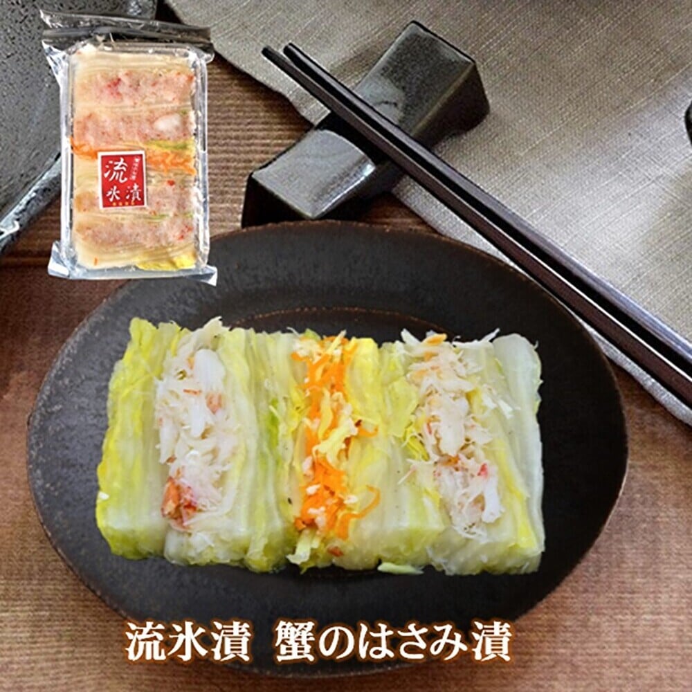 北海道で獲れたズワイガニの身をほぐし、特製甘酢で漬け、白菜の間に挟み込ました。蟹の街・稚内ならではお漬物。