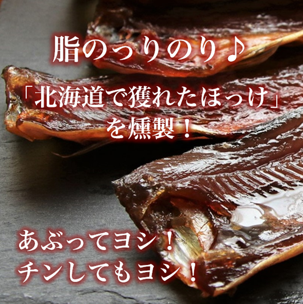 旬に取れた鮮度の良いほっけを厳選。型を揃え、食べやすくさばいて調味をほどこし、じっくり燻煙にかけ、風味豊かな燻製に仕上げました。 食べ方 皮をむきお召し上がりください。サッと炙ると香ばしさがまします。