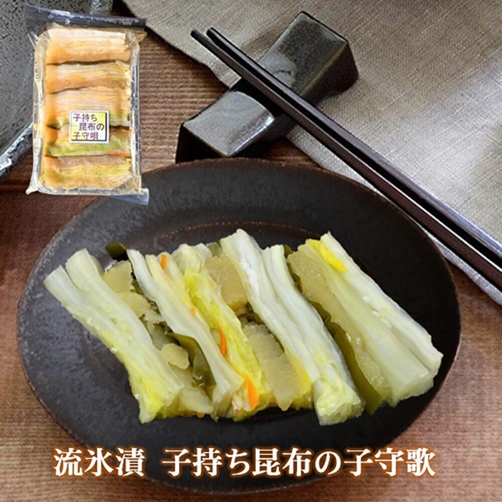 ●子持ち昆布はさみ漬 北海道産の子持ち昆布と白菜のはさみ漬。子持ち昆布のコリコリ食感と白菜のシャキシャキが絶妙!