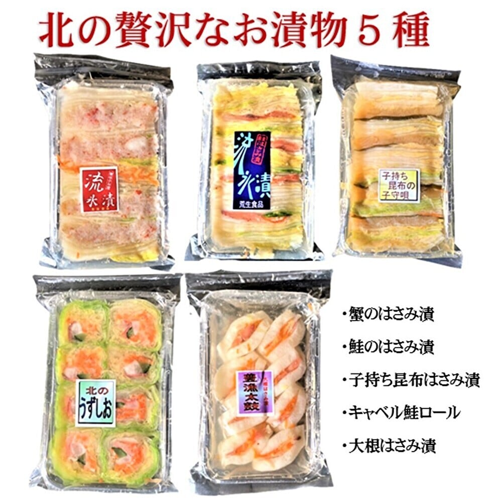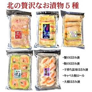 ● 蟹はさみ漬 北海道で獲れたズワイガニの身をほぐし、特製甘酢で漬け、白菜の間に挟み込ました。蟹の街・稚内ならではお漬物。