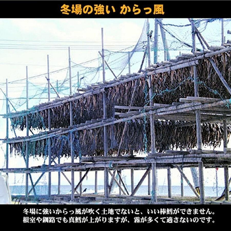 新鮮な真ダラを天日でじっくり乾燥させました。強い季節風が吹く最北端の町、稚内は棒鱈の全国一の産地!