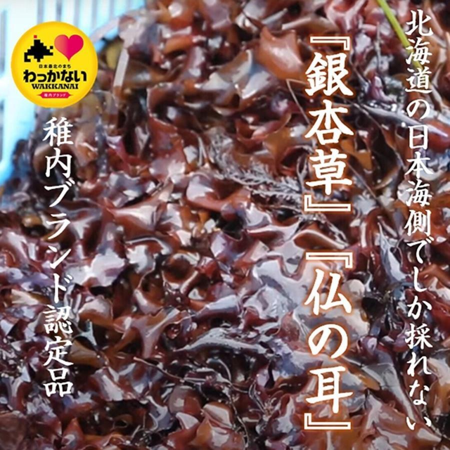 銀杏草は、北海道の日本海側でしか採れない大変希少な高級海藻。稚内の前浜で地元漁師によって丁寧に手で採取される天然海草。ほのかな磯の香りが食欲を刺激します。味噌汁に入れるとトロトロ、酢の物、サラダにするとコリコリ、様々な食感を楽しめます。