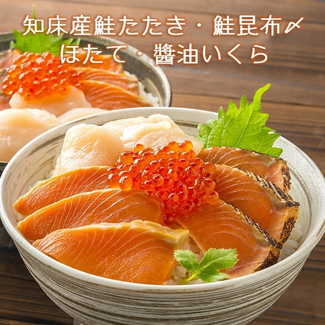 知床ウトロ産の一等検鮭を氷温熟成させた「鮭たたき」や、水揚げから数時間以内に手作業で仕上げる「無添加醤油いくら」など、新鮮な海鮮丼をご自宅でお楽しみいただけます。